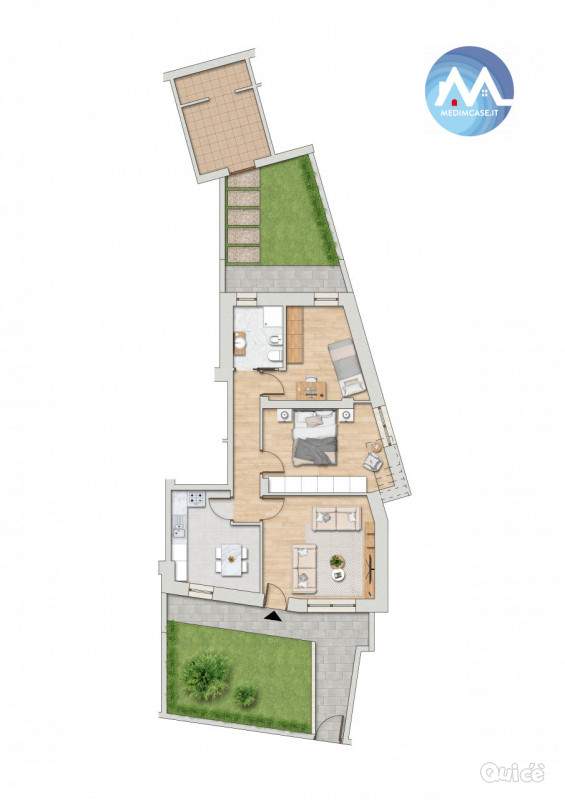 COMPOSIZIONE: l'appartamento è libero su 3 lati e misura circa 79 mq. La zona giorno è composta da un ampio soggiorno e cucina abitabile. Entrambi i vani si affacciano sullo SCOPERTO ESCLUSIVO. Attraverso il disimpegno si raggiunge il reparto notte composto da una camera doppia ed una camera singola oltre al bagno con finestra. Completano la proprietà uno scoperto di 54 mq, un deposito di 12 mq e un posto moto.