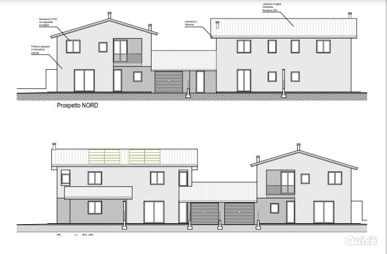Finiture: Cassonetti monoblocco a scomparsa per contenimento avvolgibili con falso telaio e guide di scorrimento. Avvolgibili in alluminio con motorizzazione. Serramenti esterni in PVC bianco liscio, rispondenti alle caratteristiche imposte dalla normativa, con vetrocamera basso emissivo. Portoncino d'ingresso per esterni in PVC color bianco liscio, ad una anta, opaco e coibentato, con caratteristiche di sicurezza. Serramenti interni in laminato bianco liscio o tinta legno ad un'anta o a scomparsa. Porte REI di divisione tra autorimessa e abitazione come da normativa VV.FF. Battiscopa interno in legno color bianco liscio. Portoni sezionali per le autorimesse.