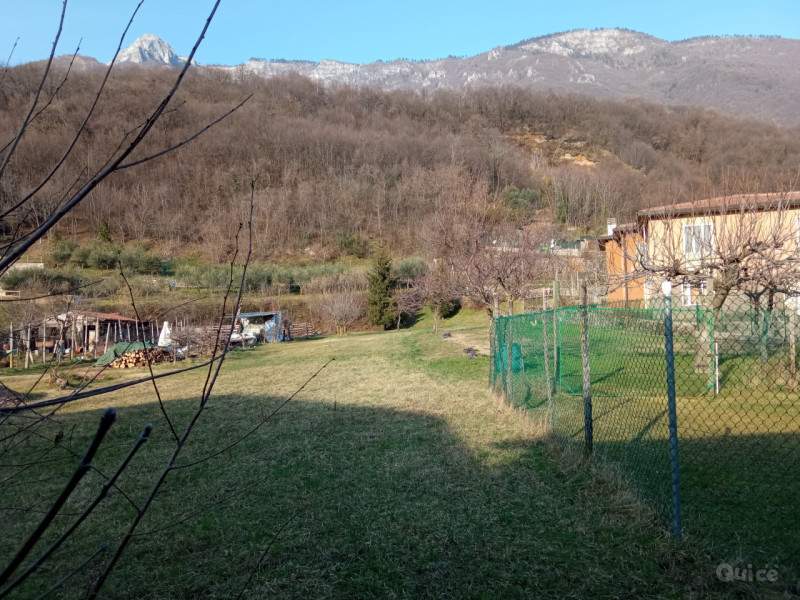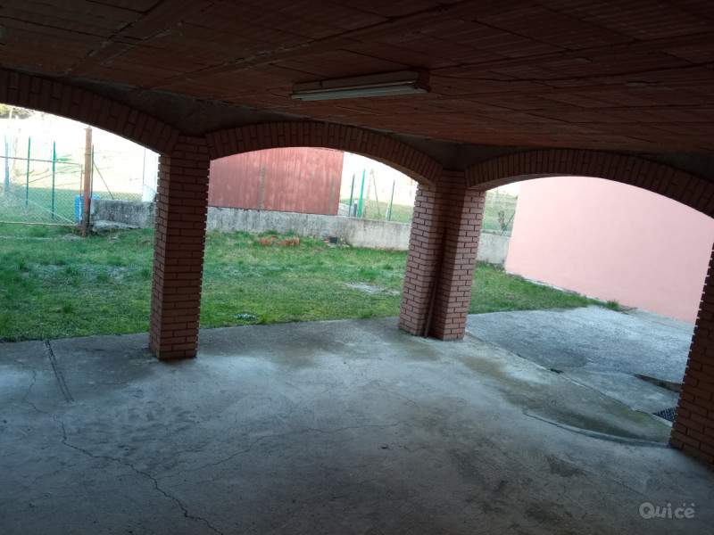 Dalla strada, oltre il cancello di ingresso, percorriamo lo scivolo e arriviamo al grande porticato dal quale possiamo goderci la vista delle montagne oltre al terreno di proprietà di 1000mq.